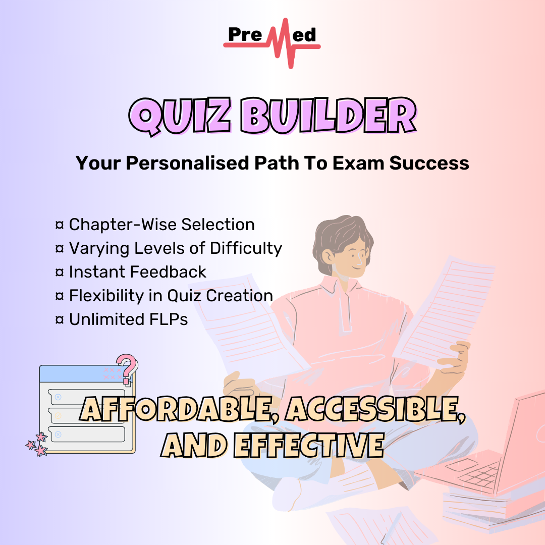 PreMed’s Quiz Builder tool transforms your exam preparation by allowing you to create personalized quizzes made to your unique needs. Here’s how Quiz Builder, along with unlimited FLPs, customized mocks and Half Book Tests can become your secret weapon in the final days before the exam.